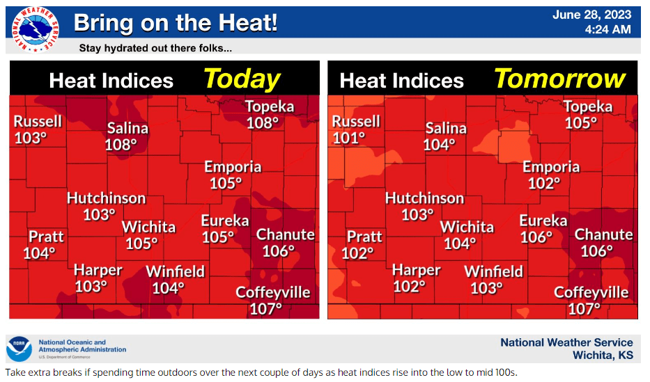 Sedgwick County is not included, though Butler, Sumner and Cowley Counties are. Higher humidity will lead to heat index number up to 105 in some places today.